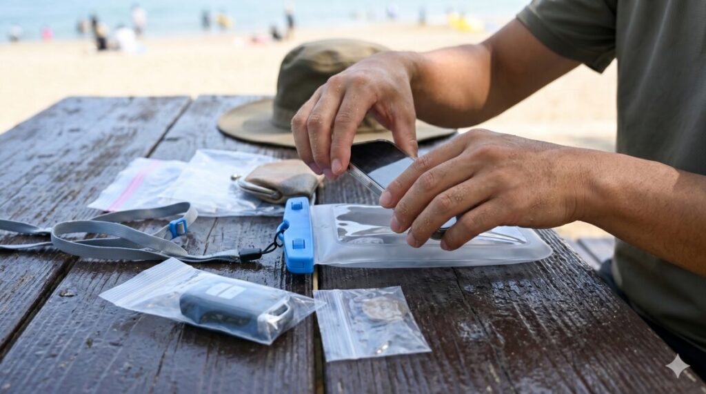 - チャック付きビニール袋(ジップロックなど):車の電子キーはこれに入れて密閉し、絶対に濡れないカバンの奥底へ。